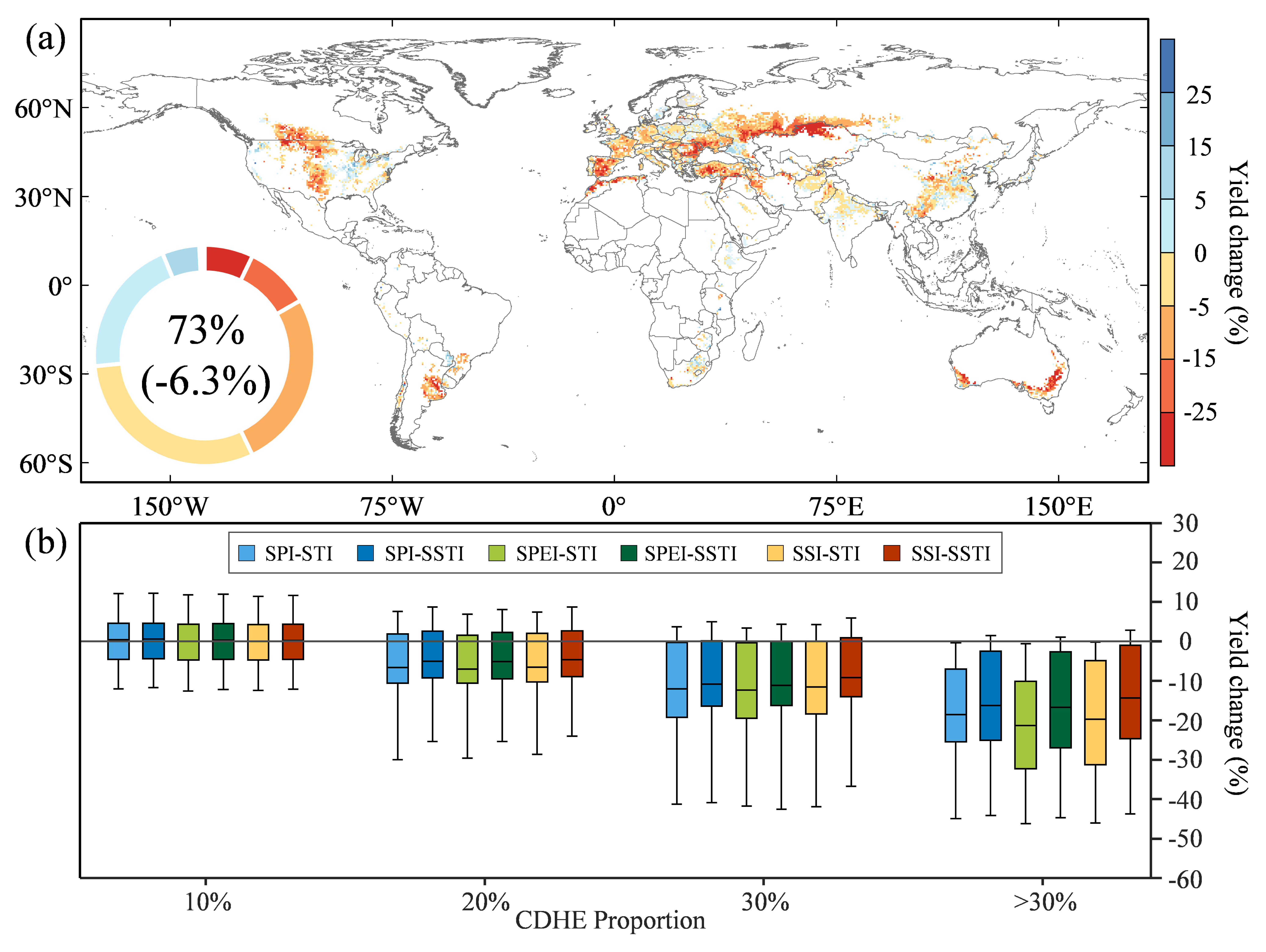 随着全球气候持续变暖,干旱和高温极端事件复合发生的情况在全球农业区日益增加。相较于单一干旱或单一高温事件,复合干热事件往往通过水分亏缺与热胁迫的协同作用,对作物生长发育造成更强影响。小麦作为全球最重要的粮食作物之一,对干旱和高温均高度敏感,复合干热事件已成为影响其生长季生产稳定性的重要气候因素。然而,干旱和高温过程本身具有多种刻画方式,不同指标组合对复合干热事件的识别结果及其农业意义可能并不相同。围绕这一科学问题,厘清全球小麦生长季复合干热事件的变化特征,并比较不同指标组合对事件识别和产量影响表征的差异,对于深化认识气候变化背景下复合干热事件演变及其对小麦产量影响的形成机制具有重要意义。