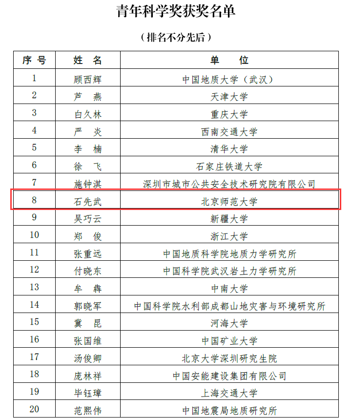 近日,中国灾害防御协会正式公布2025年度灾害防御科学技术奖评选结果,该奖项旨在表彰在灾害防御领域基础研究、技术创新与成果转化等方面做出突出贡献的个人和团队。经过严格评审,本年度共评选出特别成就奖2名、青年科学奖20名、科技进步奖31项、创新应用奖24项、科学技术普及奖19项。其中,地理科学学部灾害风险研究院石先武老师因其在相关领域的优秀科研成果和突出表现,荣获青年科学奖。