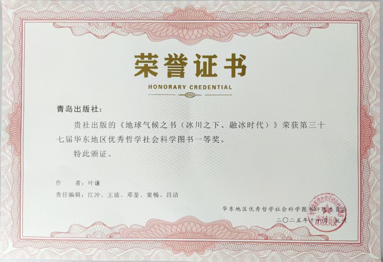 近日,第三十七届华东地区哲学社会科学优秀图书奖评选结果揭晓。我院叶谦教授所著的科普大众系列读物《冰川之下:揭开古气候的秘密》与《融冰时代:极端天气来了》(青岛出版社出版),凭借其卓越的科学性、思想性和普及性,从众多参评作品中脱颖而出,双双荣获一等奖。